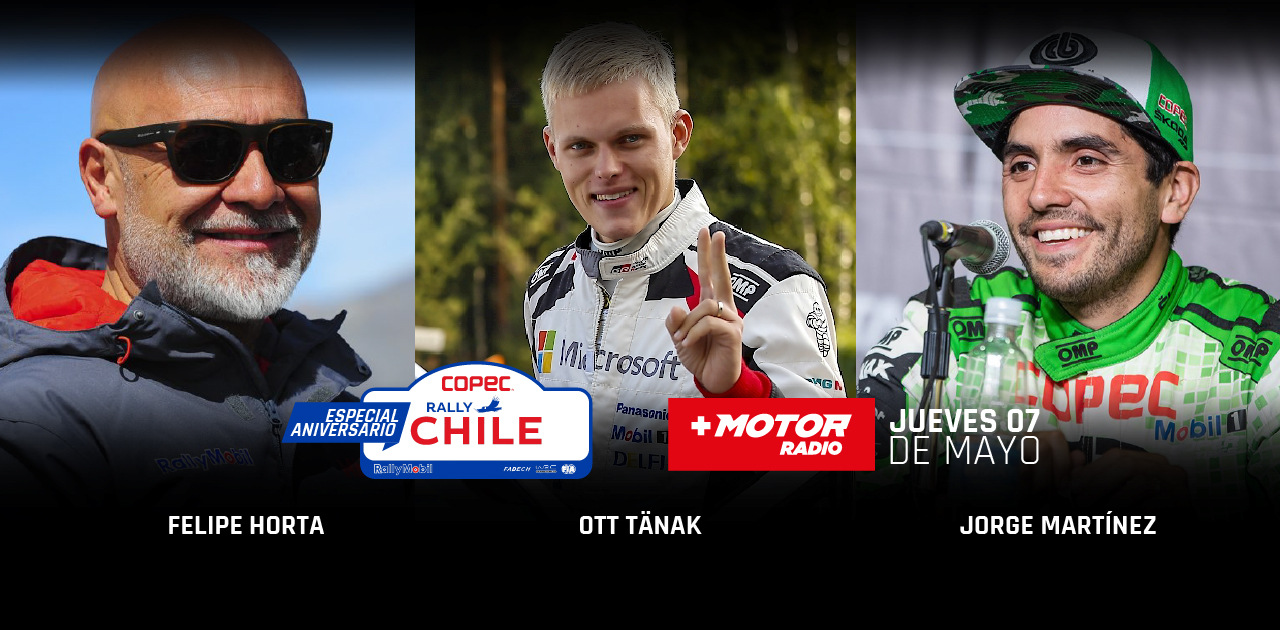 En esta edición de +Motor Radio del día jueves 7 de mayo, nos acompañan FELIPE HORTA, productor general Campeonato Copec RallyMobil™, JUAN FRANCISCO CARRASCO, productor ejecutivo Campeonato Copec RallyMobil™. También nos acompañan JORGE MARTÍNEZ, piloto CBTECH Rally Team, PEDRO HELLER, piloto Jocker Rally Team y el invitado especial, OTT TANAK, campeón 2019 WRC.