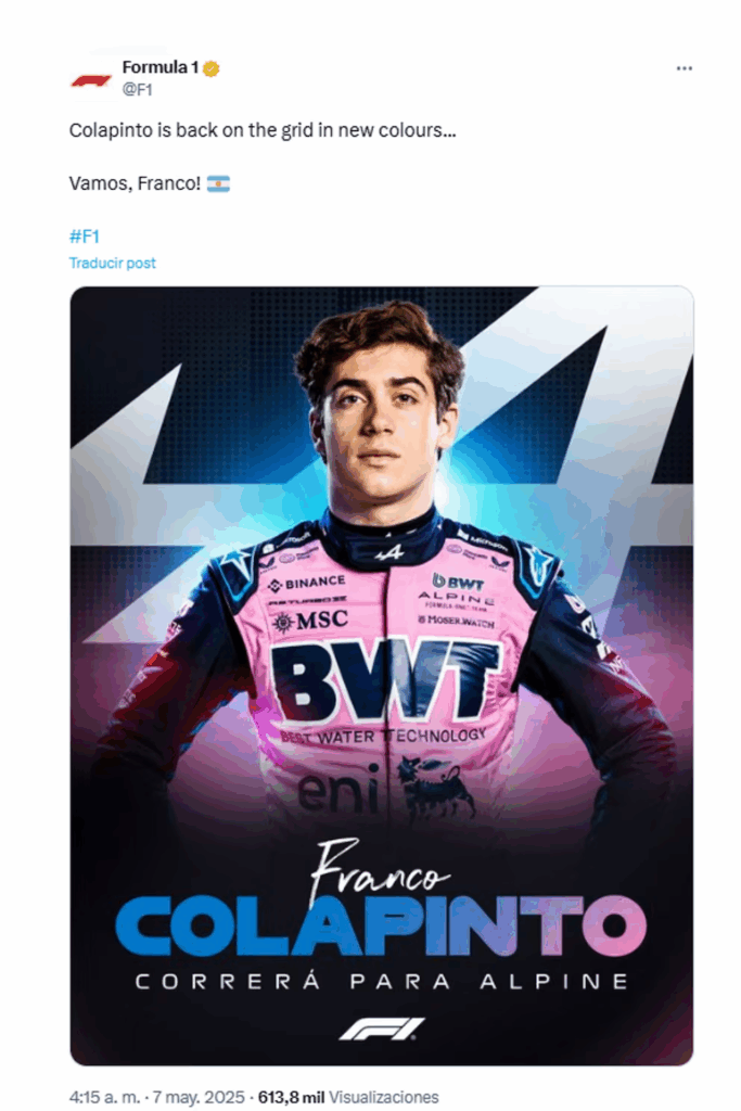 Según detallaron, el sudamericano de 21 años tiene un contrato vigente para los próximos cinco Grandes Premios: Emilia Romaña (18 de mayo), Mónaco (25 de mayo), España (1 de junio), Canadá (15 de junio) y Austria (29 de junio). Eso no inhabilita que pueda continuar al mando del monoplaza A525 una vez que finalice este período.
