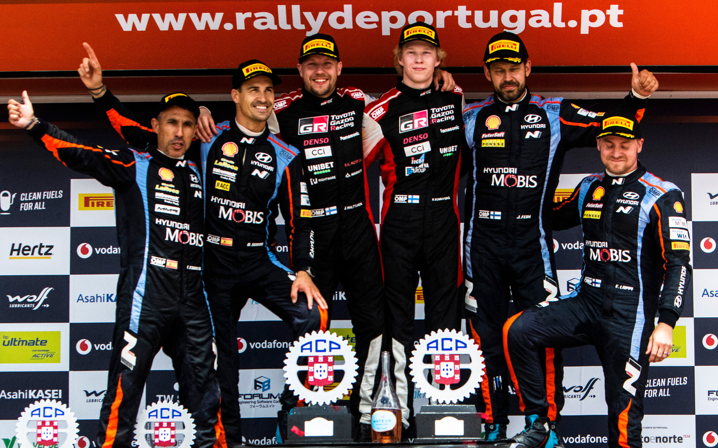 Kalle Rovanperä (FIN) Jonne Halttunen (FIN) Del equipo TOYOTA GAZOO RACING WRT celebran en el podio en primer lugar después de ganar el Campeonato Mundial de Rally en Oporto, Portugal el 14/05/2023 con Dani Sordo (ESP) Carrera Cándido (ESP) Del equipo HYUNDAI SHELL MOBIS WORLD RALLY TEAM segundo lugar y Esapekka Lappi (FIN) Janne Ferm (FIN) De HYUNDAI SHELL MOBIS WORLD RALLY TEAM tercer lugar.