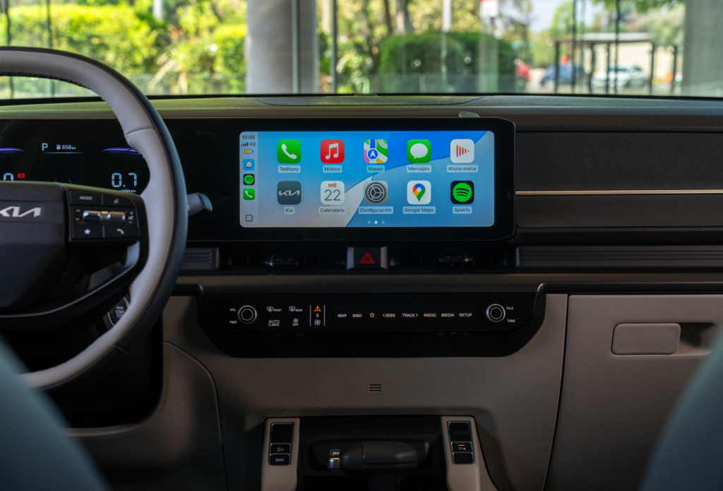 El modelo incorpora un clúster de supervisión LCD a color de 4,2”, una pantalla táctil LCD de 8 o 12,3 pulgadas según versión, junto con un sistema de infoentretenimiento compatible con Apple CarPlay y Android Auto inalámbricos, además de Bluetooth con reconocimiento de voz. Para una mayor conectividad interior, Carens a lo largo de sus 3 filas de asientos ofrece 6 puertos USB en total (2 frontales, 2 segunda fila, 2 tercera fila), y cargador inalámbrico para celulares frontal.