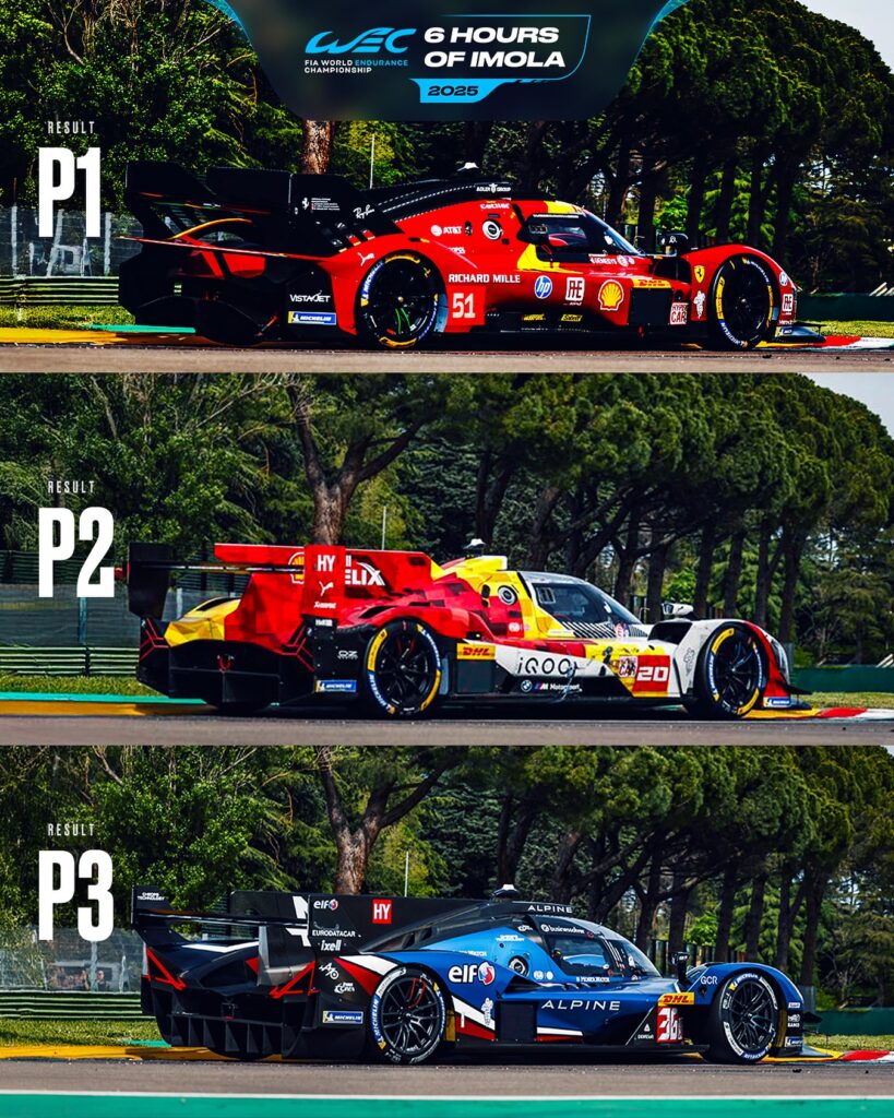 Cabe consignar que las 6 horas de Imola fueron ganadas por Ferrari con el trío conformado por Antonio Giovinazzi, Alessandro Pier Guidi y James Calado. Segundo remató BMW y tercero Alpine en una tripulación que tiene como uno de sus estandartes a Mick Schumacher, hijo del legendario Michael Schumacher.