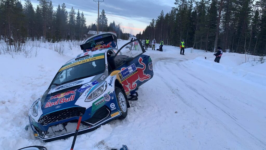 Lorenzo Bertelli (Fiesta WRC) abandonó temprano al caer en la profundidad de un banco de nieve y Pierre-Louis Loubet (i20 WRC) problemas técnicos luego de un percance similar.