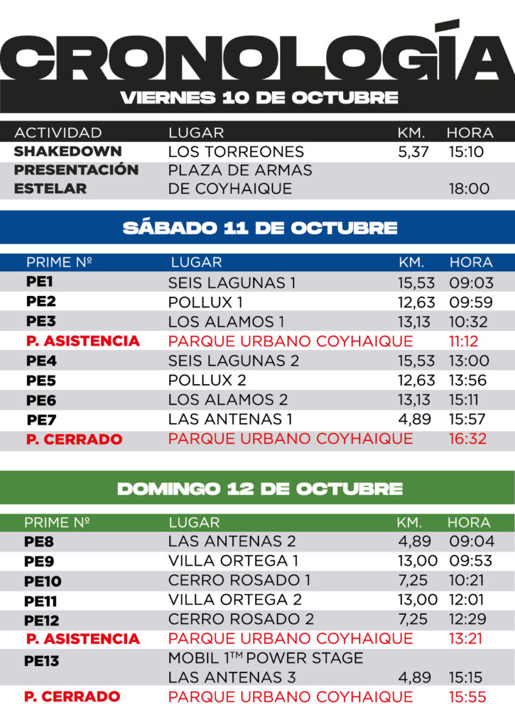 Cabe destacar que el Rally Aysén Coyhaique 2025 largará oficialmente el viernes 10 de octubre a las 14:00 horas con el Shakedown en el sector de Los Torreones, tras lo cual se desarrollará la Largada Protocolar en la Plaza de Armas de Coyhaique (19:00 horas), mientras que la carrera en si se llevará a cabo entre el sábado 11 y domingo 12 de octubre con un cronograma que contempla la realización de 13 pruebas especiales, incluyendo la realización del Mobil1 PowerStage en el sector de Las Antenas que entregará 3, 2 y 1 punto adicional a quienes consigan los mejores tiempos en ese tramo.