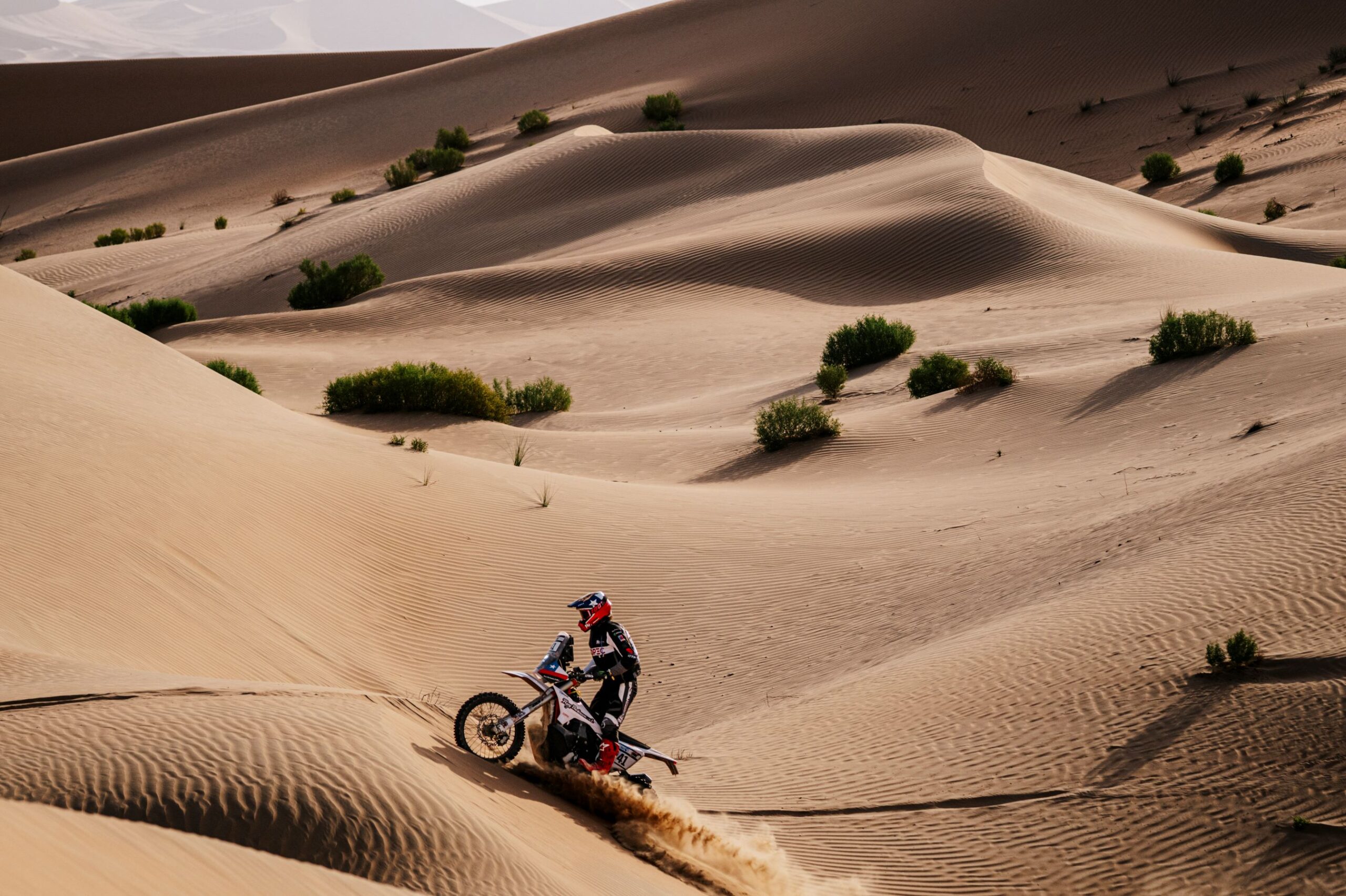 La etapa entre Marathon Camp y Mezaira’a fue de 394 kilómetros, 300 cronometrados, la más larga de la carrera. Tras 3 mil metros de enlace para llegar al inicio de la especial, el menú fue: 25% arena, 24% dunas, 20% lago seco, 6% tierra y 25% asfalto final para el enlace.