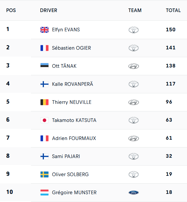 El galés se mantuvo en esa posición hasta el final y sumó 17 puntos vitales para mantener su ventaja en el campeonato, aunque reducida a nueve puntos sobre Ogier, con Tanak a sólo 12 puntos.