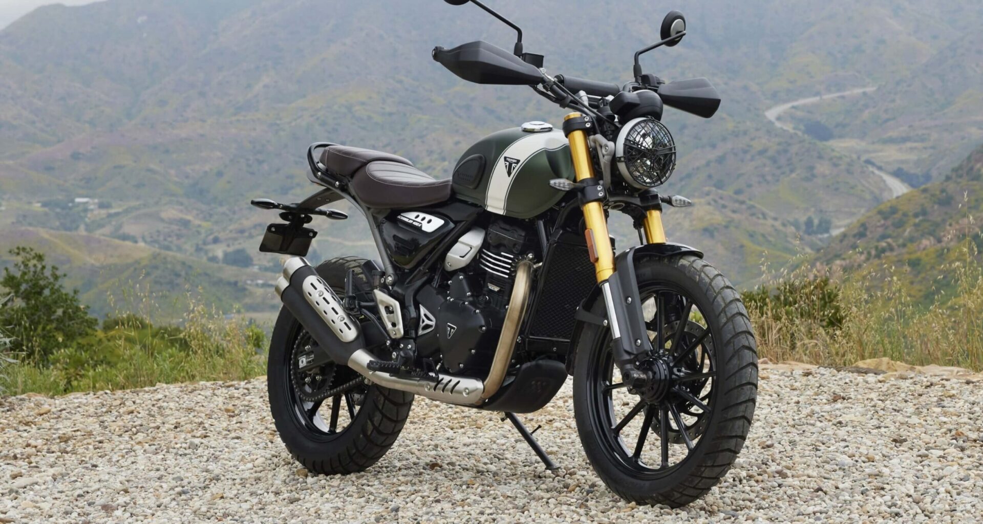 Para acentuar su actitud, la Scrambler 400 X luce protectores para foco, radiador y cárter, el manillar con almohadilla y un guardabarros delantero más largo. La característica franja “Scrambler” y el escudo triangular de Triumph en el depósito estarán en sus tres opciones tonales: Matt Khaki Green con Fusion White, Carnival Red con Phantom Black y Phantom Black con Silver Ice.