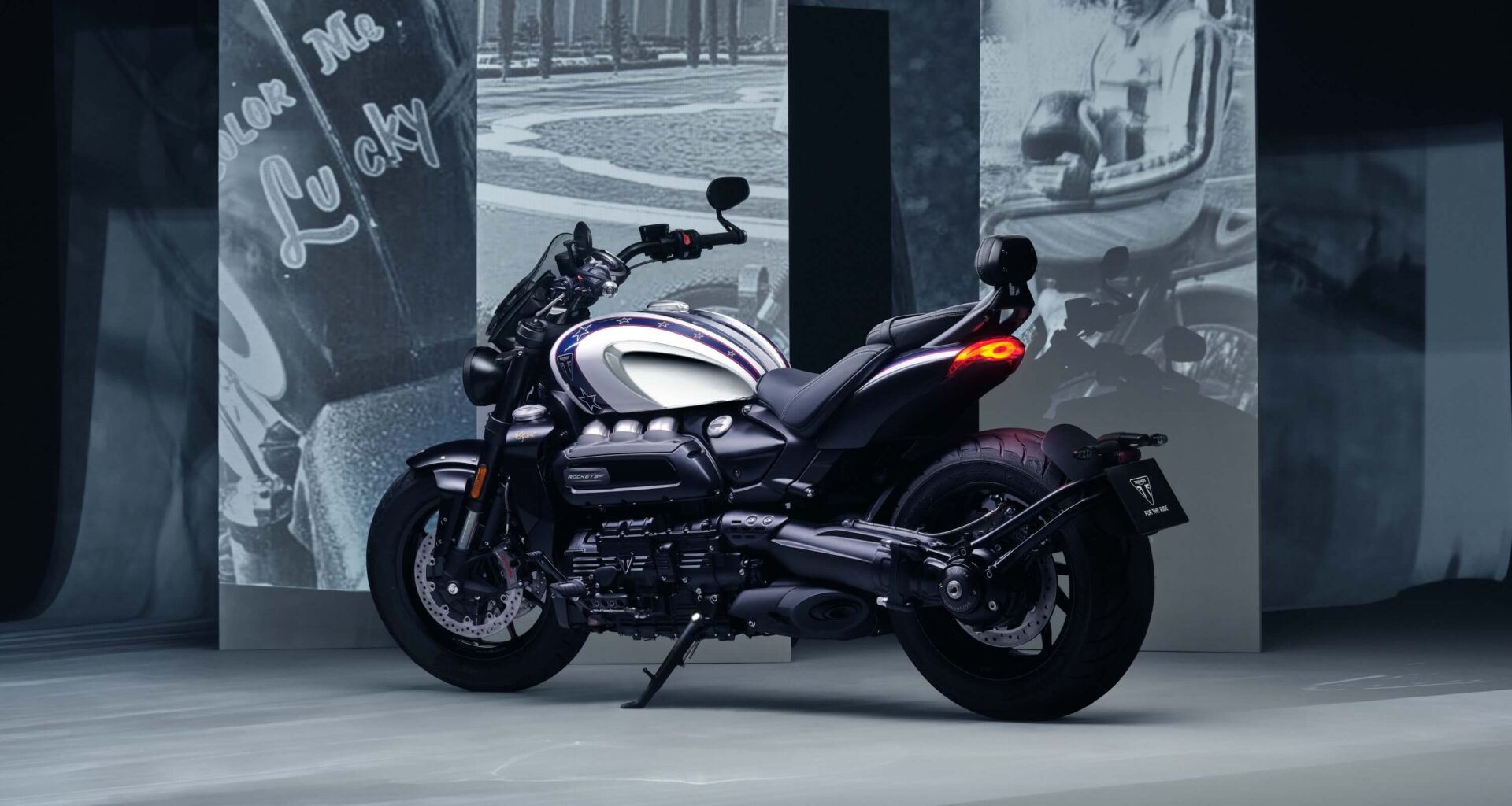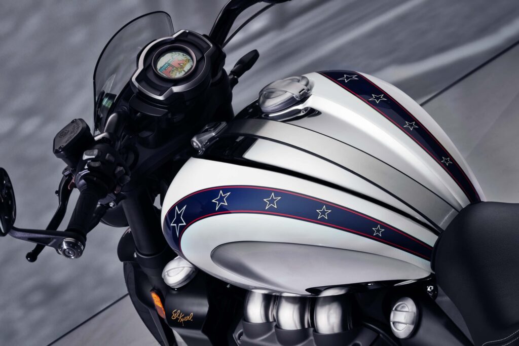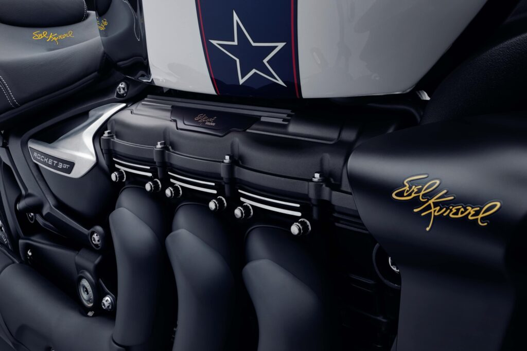 La nueva Rocket 3 Evel Knievel Limited Edition destaca por su exclusiva silueta, que luce un depósito de combustible cromado que evoca el icónico traje blanco del acróbata, con gráficos de barras y estrellas, además de detalles en rojo, azul y blanco. El esquema de colores continúa hasta el guardabarros delantero, donde se ha incorporado un nuevo emblema “EK’”.