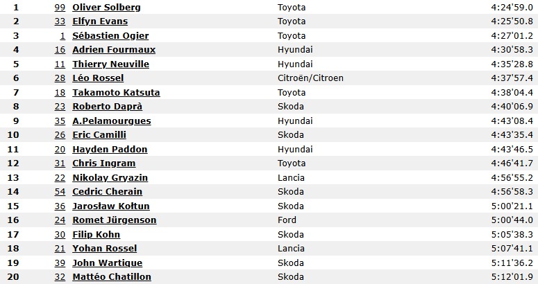 Solberg cerró el rally con 52 segundos de ventaja sobre Evans y con algo más de dos minutos sobre el nueve veces campeón del mundo Ogier.
